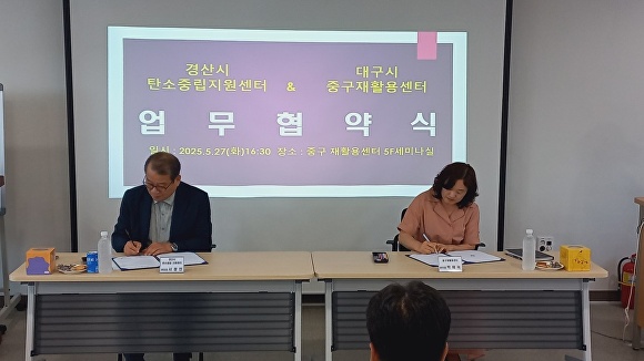 협약식에는 서정인 경산시탄소중립지원센터장과 박해숙 대구 중구 자원재활용센터장을 비롯한 양 기관 관계자들이 참석해 협약서에 공동 서명하고, 향후 협력 방안에 대한 의견을 나눴다.