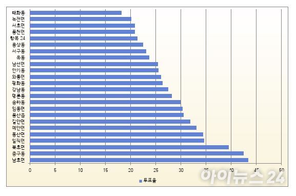 반면, 태화동(18.21%), 녹전면(20.12%), 풍천면(20.85%), 서후면(20.84%) 등은 비교적 낮은 투표율을 기록했다.