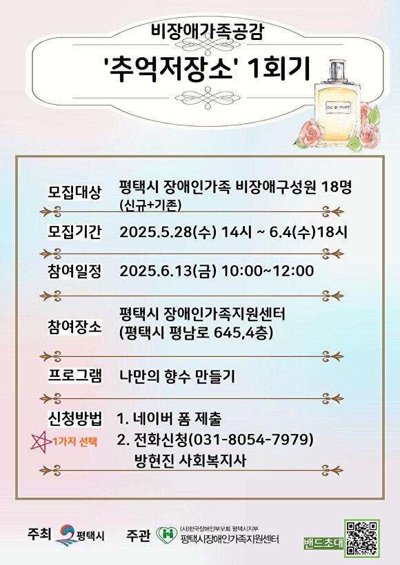 [아이뉴스24 최화철 기자] 경기도 평택시 장애인가족지원센터가 다음달 4일까지 비장애가족공감 ‘추억저장소’ 1회기 참여자를 모집한다고 30일 밝혔다.