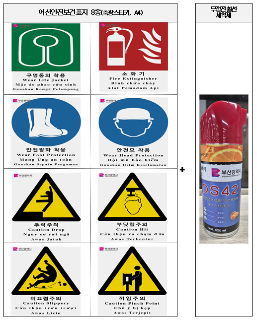 어선안전보건표지는 선내 작업 공간에 부착해 어선원의 안전 경감식을 강화하고, 무정전 활선 세척제는 먼지 등으로 인한 어선 화재 사고를 예방하는 데 사용할 수 있다.