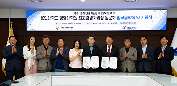 [아이뉴스24 정재수 기자] 경기도 용인특례시는 재단법인 용인시자원봉사센터와 용인대학교 경영대학원 최고경영자과정 동문회가 ‘지역사회 발전과 자원봉사 활성화를 위한 업무협약’을 체결했다고 3일 밝혔다.