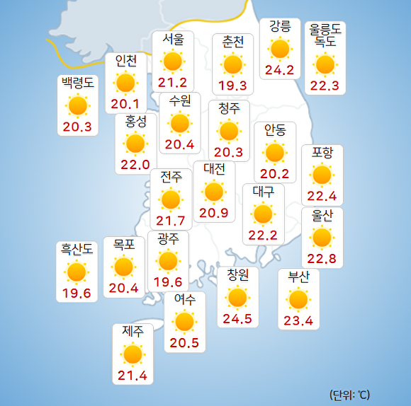 부산지방기상청에 따르면 이날 오전 9시 현재 주요 지역의 기온은 부산 23.4도, 울산 22.8도, 창원 24.5도로 기록됐다.