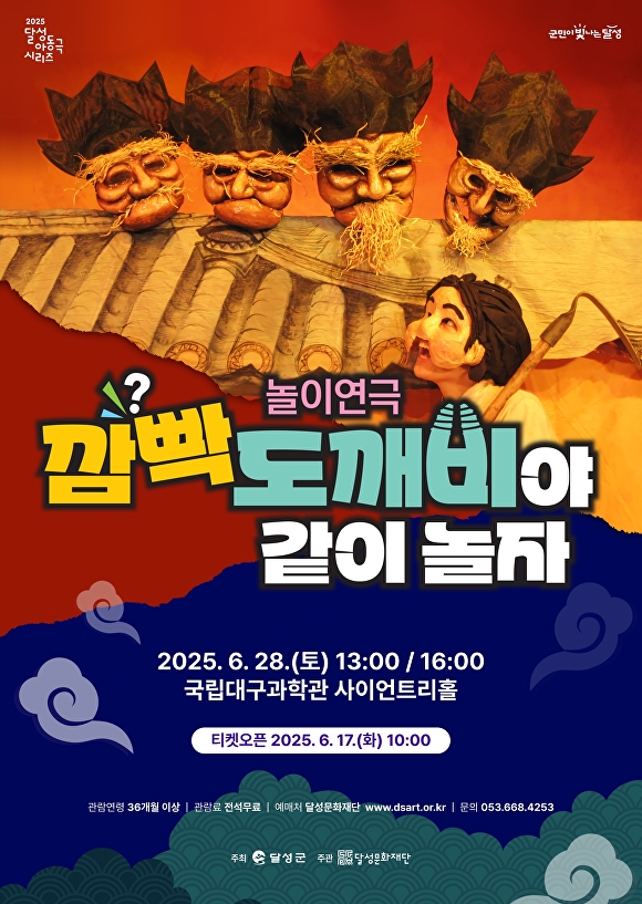 [아이뉴스24 이창재 기자] 대구 (재)달성문화재단은 ‘2025 달성 아동극 시리즈’ 두 번째 공연으로 창작 마당극 ‘깜빡도깨비야 같이 놀자’를 오는 28일 국립대구과학관 사이언트리홀에서 오후 1시와 4시, 총 2회 개최한다고 16일 밝혔다.