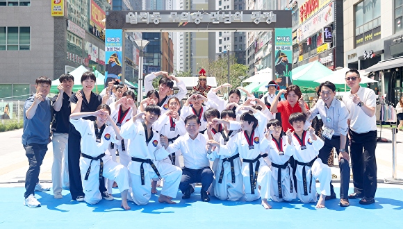 박승원 시장이 지난 6일 일직동 상가번영회가 개최한 무의공 음식문화거리 늘봄축제에서 축제 참여자들과 기념 촬영을 하고 있다. [사진=광명시]