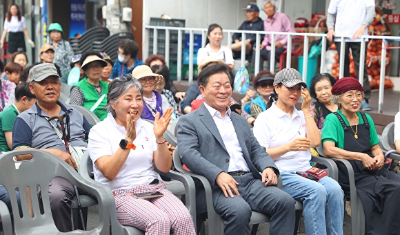 박승원 시장이 지난 15일 소하2동 상업지구 상가번영회가 개최한 '초여름 실버콘서트'에 참석해 지역주민들, 상인들과 함께 행사를 즐기고 있다. [사진=광명시]