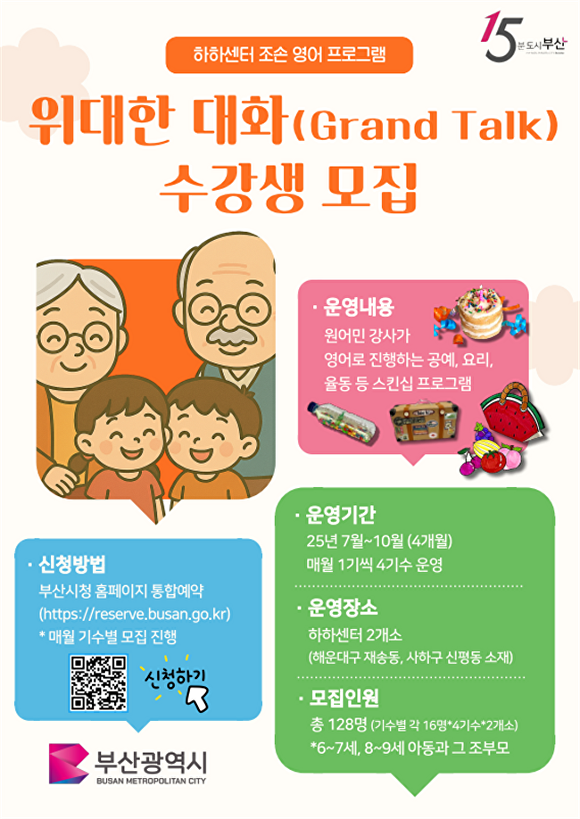 [아이뉴스24 정예진 기자] 부산광역시가 신노년세대 사회참여 공간인 하하센터에서 17일부터 오는 30일까지 조손 영어프로그램 ‘위대한 대화’ 강좌 1기 수강생을 모집한다.