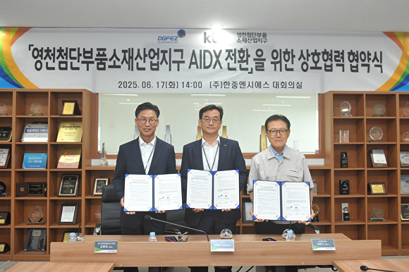 [아이뉴스24 이창재 기자] 대구경북경제자유구역청(청장 김병삼)은 17일 KT 대구경북광역본부, 영천첨단부품소재산업지구 입주기업협의회와 함께 AIDX(AI+Digital Transformation) 전환을 위한 3자 간 업무협약(MOU)을 체결했다고 밝혔다.