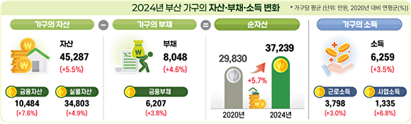 18일 동남지방통계청이 발표한 ‘2024년 동남권 가구의 자산·부채·소득 변화’에 따르면 부산은 평균 자산 증가세를 유지하고 있지만 가계부채 증가 속도는 전국보다 빠르고 소득은 정체를 보이며 ‘고부채-저소득’ 구조가 뚜렷해지고 있는 것으로 나타났다.