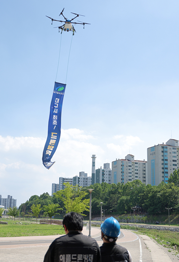 [아이뉴스24 이창재 기자] 대구 북구청(청장 배광식)은 지난 23일 팔거천 동천교 하단에서 ‘모기유충 구제 드론방역 시연식’을 개최하고 대구시 최초로 드론을 활용한 친환경 감염병 예방 방역 사업에 본격 착수했다.