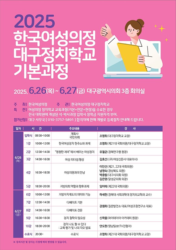 한편, 한국여성의정 대구정치학교는 여성의 정치참여 확대를 위한 교육과 네트워크 구축 활동을 지속적으로 운영하고 있으며, 향후 심화과정과 후속 프로그램도 이어질 예정이다.