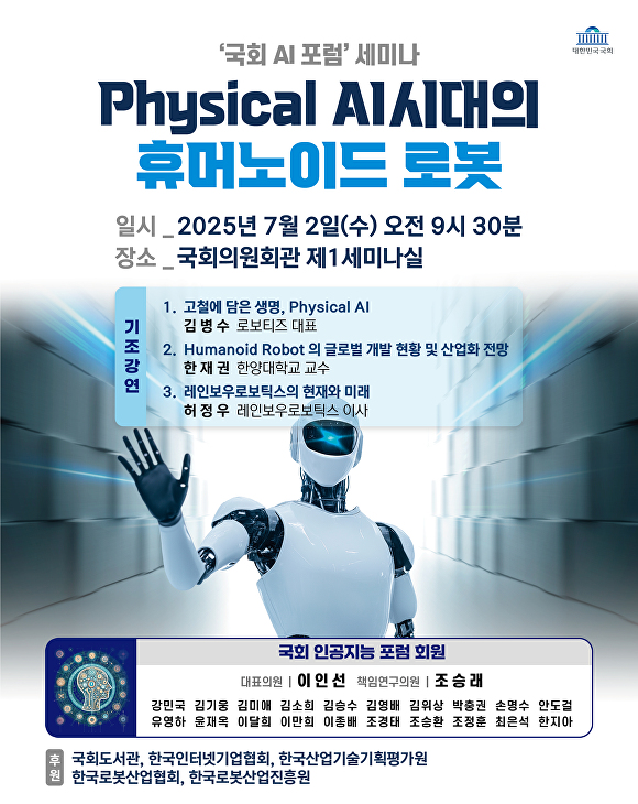 [아이뉴스24 이창재 기자] 국회의원연구단체 ‘국회 인공지능포럼’(대표의원 이인선, 책임연구의원 조승래)은 오는 7월 2일 오전 9시 30분 국회의원회관 제1세미나실에서 ‘Physical AI 시대의 휴머노이드 로봇’을 주제로 세미나를 개최한다고 30일 밝혔다.