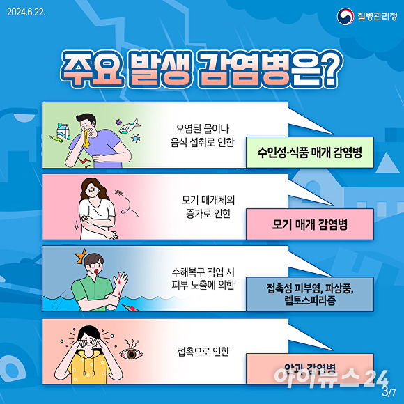 또한 수해 복구 작업 시 접촉성 감염병을 예방하기 위해 △방수 보호복과 장갑 착용 △노출 피부는 즉시 깨끗한 물로 세척 △작업 중 상처 발생 시 신속히 의료기관 방문 등의 조치가 요구된다.
