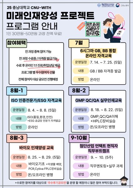 [아이뉴스24 강일 기자] 충남대학교가 지역 청년들을 대상으로 실무 중심의 직무교육과 실습 기회를 제공하는 ‘거점특화 CNU-WITH 미래인재양성 프로젝트’ 참여자를 모집한다.