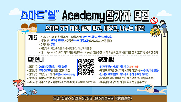 [아이뉴스24 박종수 기자] 전북자치도 전주시설공단(이사장 이연상)이 미취학 아동을 대상으로 스마트 기기 과의존 예방을 위해 ‘스마트 쉼 아카데미’를 운영한다.