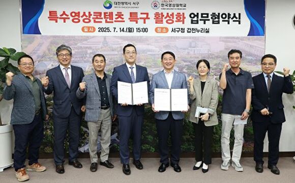 [아이뉴스24 강일 기자] 대전서구는 14일 구청 갑천누리실에서 한국영상대학교와 ‘특수영상콘텐츠 특구 활성화 업무협약(MOU)’을 체결했다.