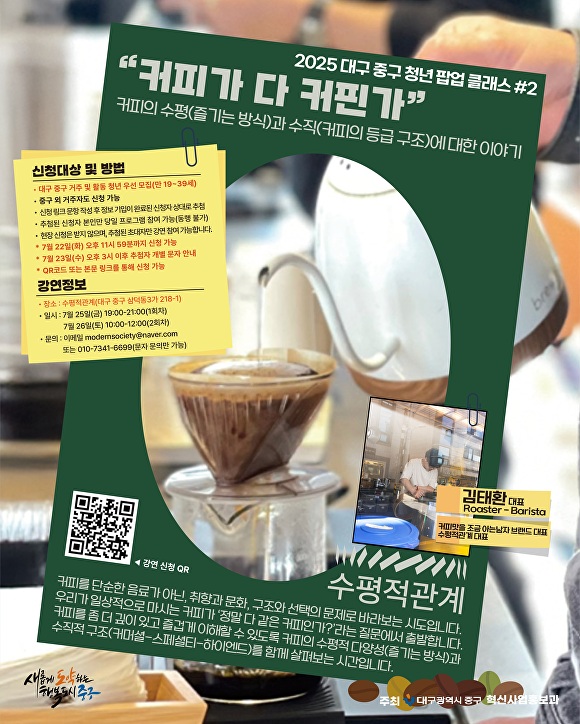 한편, 중구는 올해 10월까지 매달 ‘청년 팝업 클래스’를 운영 중이다. 명사 초청 토크콘서트, ‘커마카세’ 커피 페어링, 예비 창업자를 위한 창업 특강 등 다양한 주제의 프로그램이 진행될 예정이다.