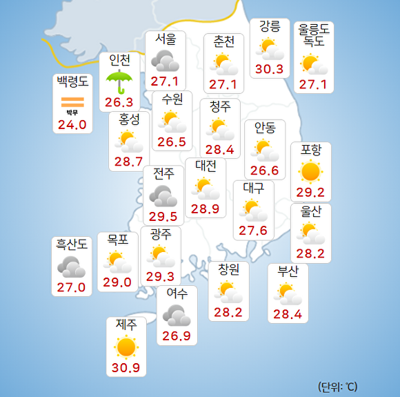 부산지방기상청에 따르면 이날 오전 9시 현재 주요 지역의 기온은 부산 28.4도, 울산 28.2도, 창원 28.2도로 기록됐다.
