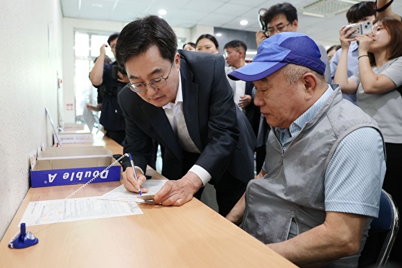 김 지사는 현장에서 신청 절차와 발급 시스템 운영 상태를 점검하고, 소비쿠폰을 신청한 도민들과 직접 소통하면서 불편한 점이나 제도 개선 의견을 청취했다.