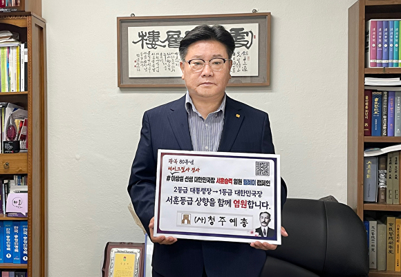 [아이뉴스24 안영록 기자] 문길곤 (사)청주예총 회장이 보재 이상설 선생의 대한민국장 서훈 승격 염원 캠페인에 동참했다. 이 캠페인은 1907년 헤이그 특사로 파견된 충북 진천군 출신 독립운동가인 이상설 선생의 공훈을 재조명하고, 현재 건국훈장 대통령장(2등급)에서 대한민국장(1등급)으로 서훈을 격상하자는 취지에서 릴레이로 진행되고 있다. 변광섭 청주시문화산업진흥재단 대표이사 지명으로 지난 18일 캠페인에 참여한 문길곤 회장은 “이상설 선생의 숭고한 희생과 업적에 걸맞은 예우가 이뤄지기를 바란다”며 다음 릴레이 주자로 이영석 (사)충북예총 회장을 지명했다.