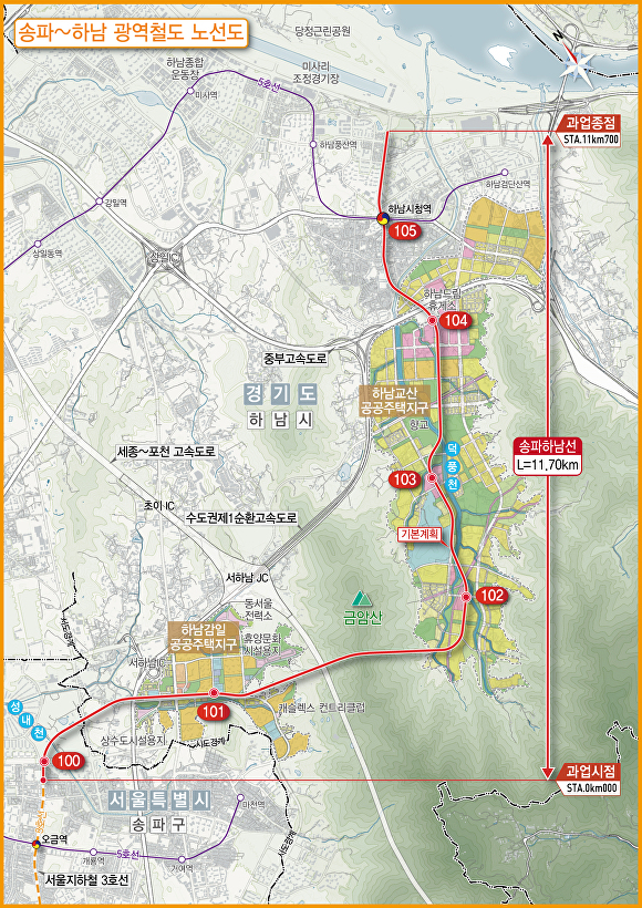 송파하남선은 서울지하철 3호선 오금역에서 하남시청역까지 총연장 11.7㎞ 구간을 연결하는 광역철도 건설사업이다.