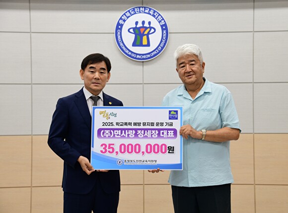 정세장(오른쪽) 면사랑 대표가 23일 서강석 진천교육장에게 학교폭력 예방을 위한 뮤지컬 운영 기금 3500만원을 기탁하고 있다. [사진=진천교육지원청]