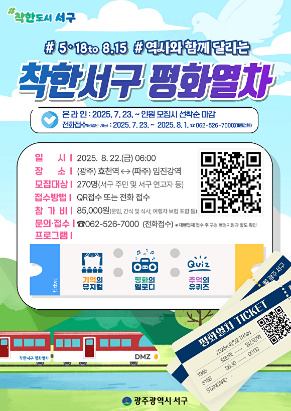 [아이뉴스24 한봉수 기자] 광주광역시 서구가 광복 80주년을 기념해 5·18과 8·15를 잇는 ‘착한서구 평화열차’ 프로그램 참여자를 모집한다고 밝혔다.