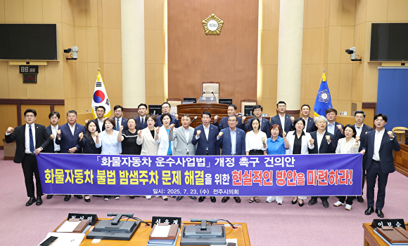 [아이뉴스24 박종수 기자] 전북자치도 전주시의회가로 국가 물류체계와 도로‧교통, 주민 생활 환경 문제 등을 초래하는 화물자동차의 불법 밤샘주차 해결을 위한 화물자동차 운수사업법 개정을 촉구하고 나섰다.