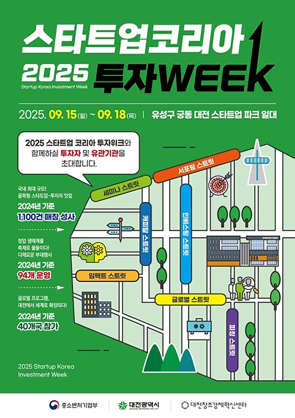 [아이뉴스24 김천겸 기자] 대전창조경제혁신센터가 오는 9월 개최되는 '2025 스타트업 코리아 투자위크(Startup Korea Investment Week)'를 앞두고 투자사·유관기관 모집을 8월 8일까지 진행한다.