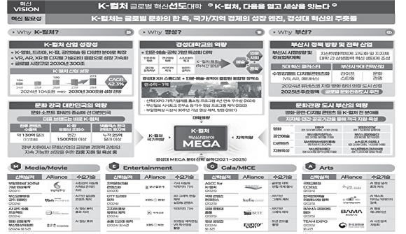 먼저 경성대는 K-컬처 글로벌 혁신 선도대학을 비전으로, 미디어·영화, 엔터테인먼트, 갈라·마이스, 예술 중심의 초실감 캠퍼스와 산학 융합 등 3대 분야 15개 전략 과제를 추진할 계획이다.