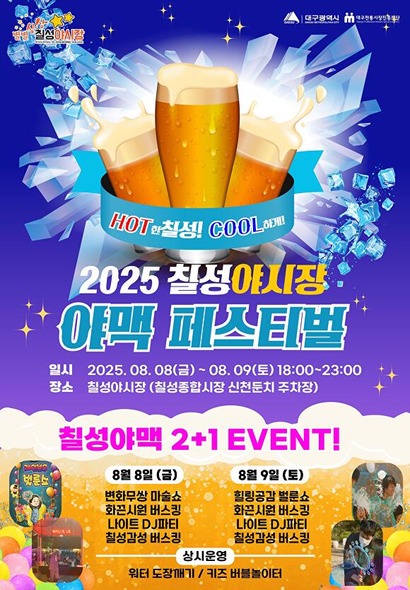 [아이뉴스24 이창재 기자] 대구시와 대구전통시장진흥재단은 연이은 폭염으로 무더위에 지친 시민들이 더위를 한방에 날려버릴 수 있도록 ‘2025 칠성야시장 야맥 페스티벌’을 8일과 9일 양일간 칠성야시장 일원에서 개최한다고 7일 밝혔다.