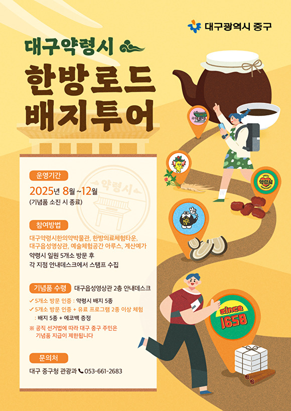 ‘한방로드 배지투어’는 △대구약령시한의약박물관 △한방의료체험타운 △대구읍성영상관 △예술체험공간 아루스 △계산예가 등 5곳을 모두 방문해 스탬프를 모으면 약령시 기념 배지 5종을 증정한다. 모든 시설은 무료 관람이 가능하다.