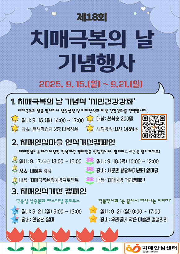 이번 기념식은 평생학습관 2층 다목적실에서 열리며, 치매극복의 날 영상 상영, 포토존 운영, 경기도의료원 안성병원 시민건강강좌 등 시민이 참여할 수 있는 다채로운 프로그램이 진행된다.