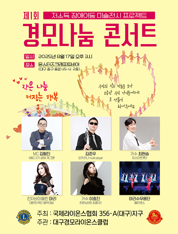 [아이뉴스24 정예진 기자] 국제라이온스협회 356-A(대구)지구가 주최하는 ‘제1회 경모 나눔콘서트’가 오는 17일 오후 3시 대구광역시 중구 종로 45-4 2층에 위치한 몬스터즈크래프트비어에서 개최된다.