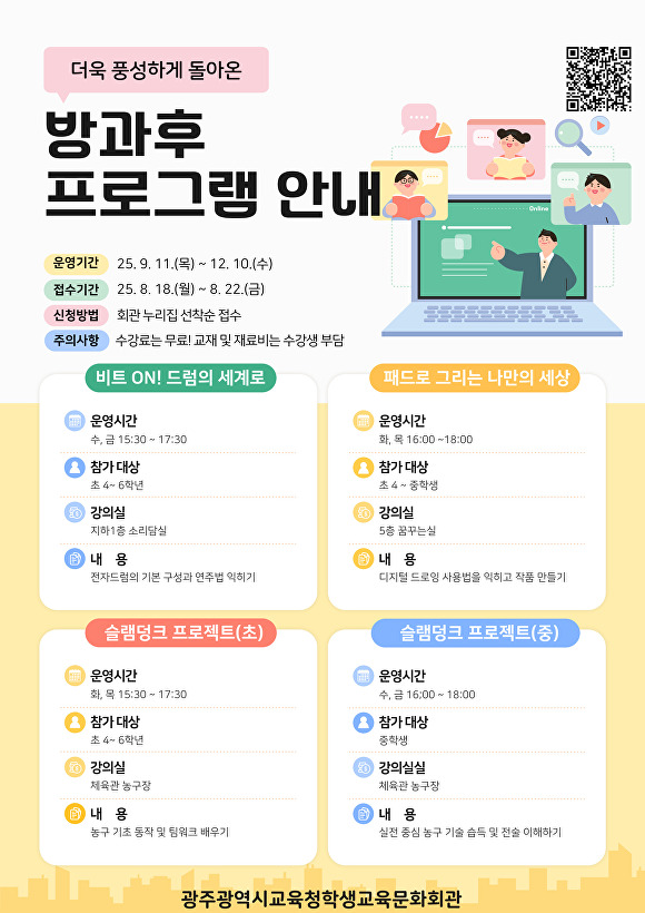 [아이뉴스24 한봉수 기자] 광주광역시교육청학생교육문화회관(이하 광주학생교육문화회관)은 오는 9월 11일부터 12월 10일까지 청소년을 대상으로 ‘2025년도 방과후 프로그램’을 운영한다고 밝혔다.