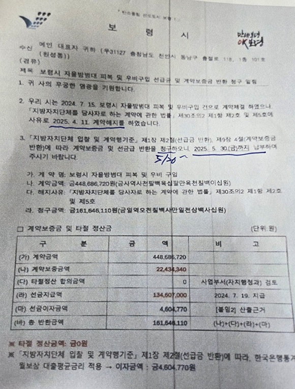 그러나 2025년 4월, 보령시는 최씨에게 계약 해지를 통보했다. 이어진 것은 선금 1억 3460만원, 선금이자 460만원, 계약보증금 2243만원 반환 요구 등 공문뿐이었다.
