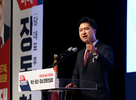 우재준 의원이 부산울산경남 합동연설회에서 청년 정치를 향한 목소리를 높이고 있다 [사진=우재준 의원실]