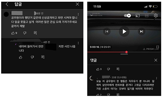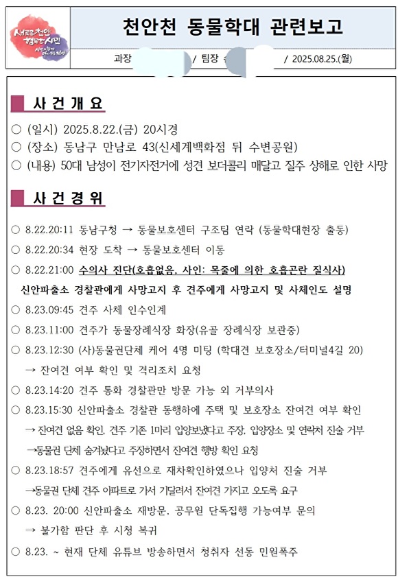한편 이번 사건이 알려지면서 메뉴얼대로 대응한 천안시 공무원을 겨냥한 과도한 비난이 쏟아졌다. 더 적극적으로 대처하지 않았다는 이유에서다.일부 온라인 게시물에는 “공무원도 목줄 매달고 뛰게 해야 한다”는 극단적 표현이 담겼고, 공무원 개인 휴대전화 번호가 퍼지면서 모욕성 문자 폭탄으로 이어졌다. 천안시는 항의 전화가 빗발쳐 업무가 사실상 마비됐다.