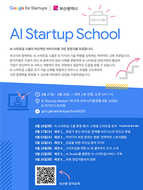 박형준 부산광역시장은 “시와 구글의 협력으로 진행하는 ‘스타트업 스쿨’이 올해는 AI 콘텐츠를 강화해 부산에서 선보이게 됐다”며 “부산이 ‘아시아 창업도시’로 자리매김하기 위해 다양한 분야에서 역량을 집중하고 있는 만큼 세계적인 기업과의 지속적인 협력을 통해 부산의 창업생태계 성장을 이끌어 나가겠다”고 말했다.