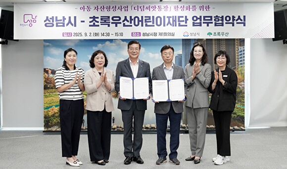 시는 2일 시청 제1회의실에서 신상진 시장과 황영기 초록우산 어린이재단 회장 등이 참석한 가운데 ‘아동 자산 형성 지원사업, 디딤씨앗통장 활성화를 위한 업무 협약’을 체결했다.