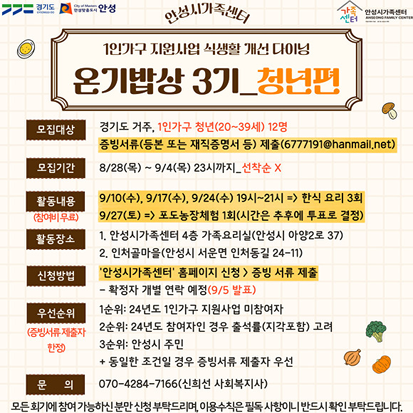 [아이뉴스24 임정규 기자] 경기도 안성시 가족센터는 1인 가구 청년층(20세~39세)을 대상으로 ‘식생활 개선 다이닝 - 온기밥상 3기’ 프로그램 참여자를 모집한다.