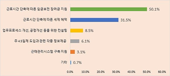 또한 정부·지자체에 바라는 지원책으로는 ‘임금보전 장려금 지원’(50.1%)이 가장 많았으며 ‘세제 혜택’(31.5%), ‘업무 프로세스 및 공정 개선 컨설팅’(8.5%), ‘정보 제공’(6.1%), ‘근태관리 시스템 구축 지원’(3.1%) 등이 뒤를 이었다.