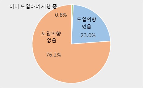 주 4.5일제 도입 의향을 묻는 질문에서는 ‘도입 계획 없음’이 76.2%로 압도적으로 높았고, ‘도입 계획 있음’은 23.0%, ‘이미 시행 중’은 0.8%에 불과했다. 도입 계획이 있는 기업 중에서는 34.5%가 ‘1년 이내’를 적정 시기로 답했다.