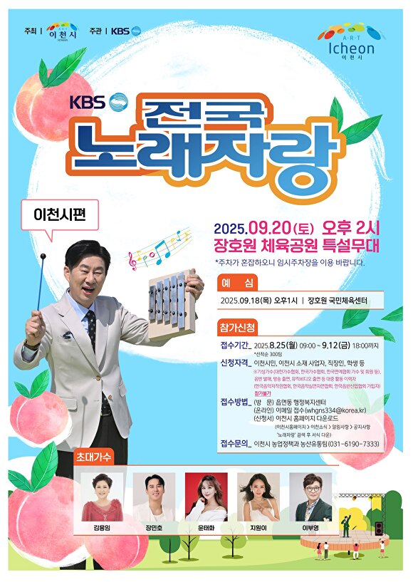 [아이뉴스24 임정규 기자] 경기도 이천시는 오는 20일 오후 2시 장호원 체육공원 특설무대에서 ‘KBS 전국노래자랑–이천시편’을 개최한다.