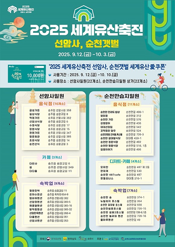 축전은 세계유산愛쿠폰을 발행해 유료 프로그램 참여자 1,500명에게 총 1,500만원 규모의 쿠폰을 제공한다. 해당 쿠폰은 선암사 인근 22개 업소와 순천만습지 인근 22개 업소에서 사용할 수 있으며, 오는 12일부터 내달 10일까지 이용 가능하다.