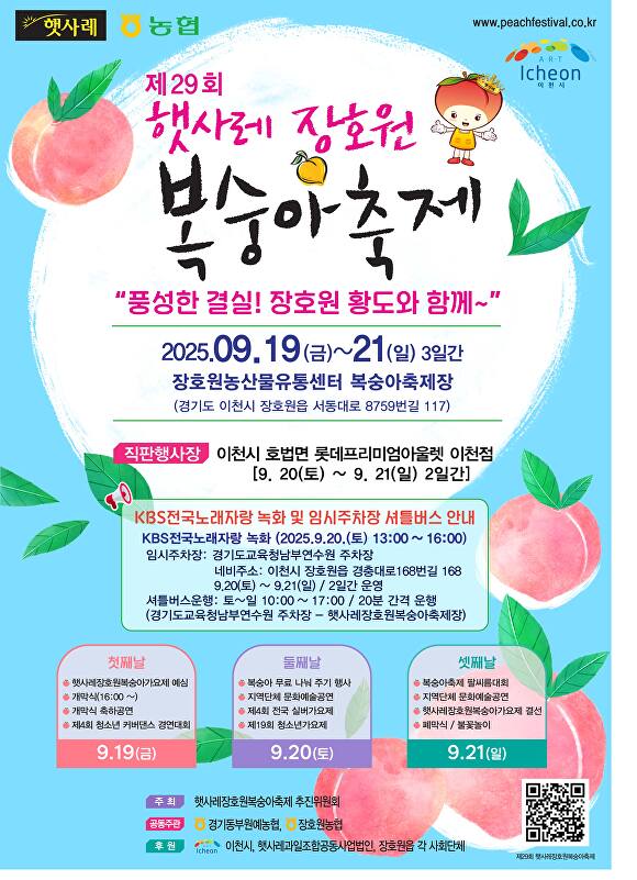 시 관계자는 “풍부한 햇살과 질 좋은 토양에서 자란 햇사레 복숭아의 우수성을 널리 알리는 대표 축제가 되길 기대한다”며 “가족, 연인과 함께 이천의 가을을 만끽하길 바란다”고 말했다.