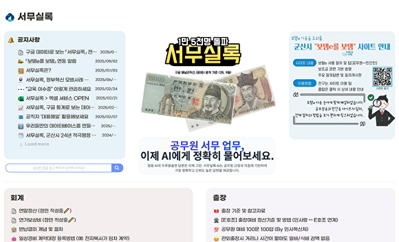 ‘서무실록’은 군산시 디지털정보담당관 권영, 이정민 주무관이 개발한 인공지능(AI) 기반의 협업형 온라인 업무 매뉴얼(officemanager.oopy.io) 이다.