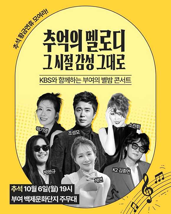 [아이뉴스24 정다운 기자] 충남 부여군은 오는 10월 6일 추석 당일 저녁 7시, 백제문화단지 주무대에서 KBS와 공동으로 특별 기획 공연 ‘부여의 별밤 콘서트’를 연다고 9일 밝혔다.