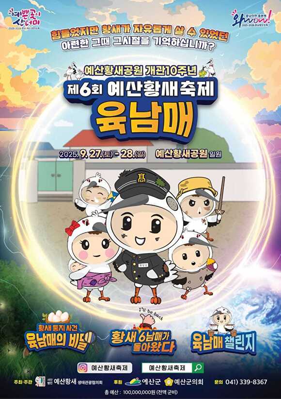 ‘예산으로 돌아온 황새 육남매’를 주제로 열리는 이번 축제는 당초 6~7일 개최 예정이었으나, 지난 7월 집중호우로 군이 특별재난지역으로 선포되면서 일정이 연기됐다. 군은 지역 상생 차원에서 축제를 연기 후 진행하기로 했다.