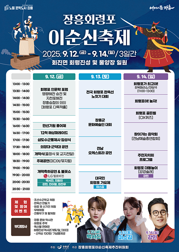 [아이뉴스24 김상진 기자] 전남 장흥군은 오는 12일부터 14일까지 3일간, 장흥군 회진면 회령진성과 회진항 물양장 일원에서 2025 장흥 회령포 이순신 축제를 개최한다고 11일 밝혔다.