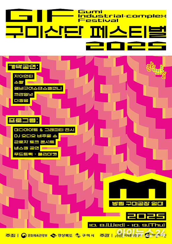 [아이뉴스24 김철억 기자] 경북 구미시는 (재)구미문화재단, 경북문화재단 콘텐츠진흥원과 함께 내달 8~9일 양일간 방림공장에서 '2025 GIF : 구미산단 페스티벌'을 연다고 16일 밝혔다.